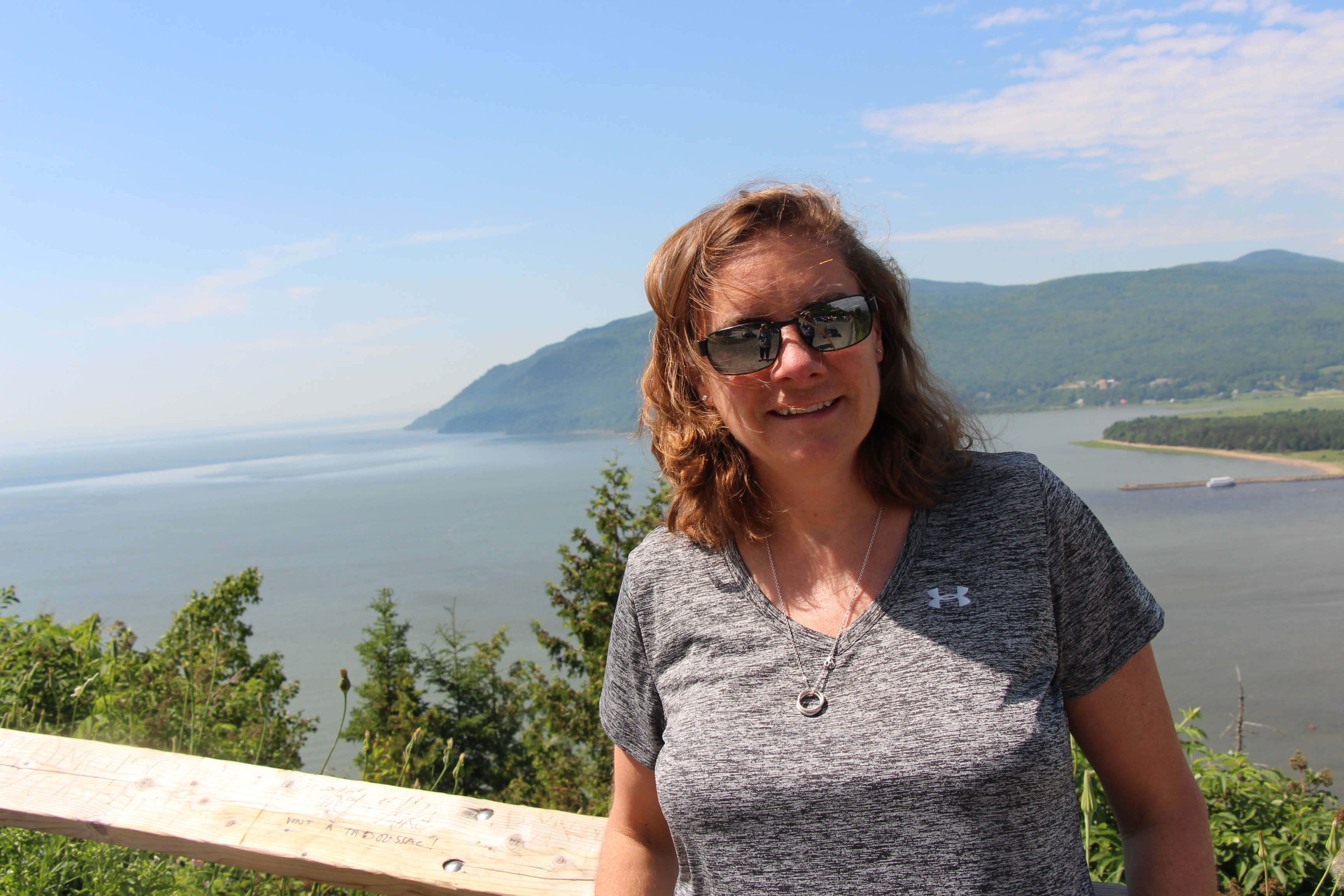Julie overlooking le Massif Charlevois et le fleuve Saint-Laurent
