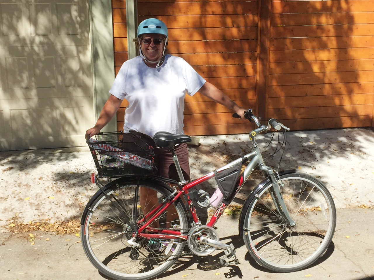 Mary in her retirement role as bike courier delivering signs to Julie's new listing