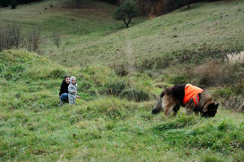 The hunters come out in force on the weekends from end of September until after Christmas. Lucia and Constantin with Thor in a hunting jacket.