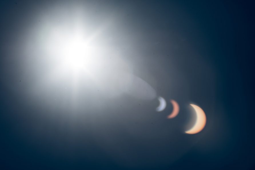 Asher Isbrucker captured the North American eclipse as seen from Vancouver where we saw a 86% solar coverage by the Moon. He didn't bring adequate equipment to create any images of the true eclipse, but this neat triple lens flare effect came about inadvertently when he aimed his 70-230mm lens at the sun on an angle, carefully looking at the live view instead of through the viewfinder.