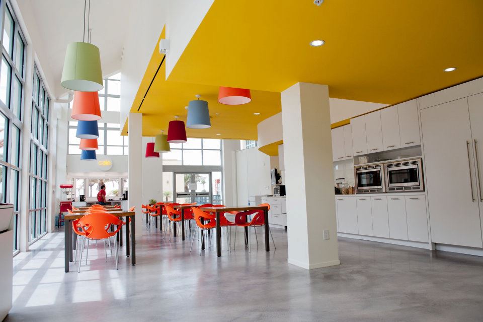 Grupo Gallegos is the award-winning Hispanic advertising agency from California. It's known for its hilarious ad campaigns for the California Milk Processor Board (Got Milk?), Comcast, and Fruit of the Loom. Architect Lorcan O'Herlihy, founder of LOHA Architects and winner of seven AIA/LA design awards and 26 national and international awards, wanted to create a "liveable working space." The Grupo Gallegos work model offers surf breaks by the pier, a fleet of beach cruisers, a full basketball and indoor football court, gym, a batting cage, spinning and yoga classes, and plenty of space to run laps around the office.
