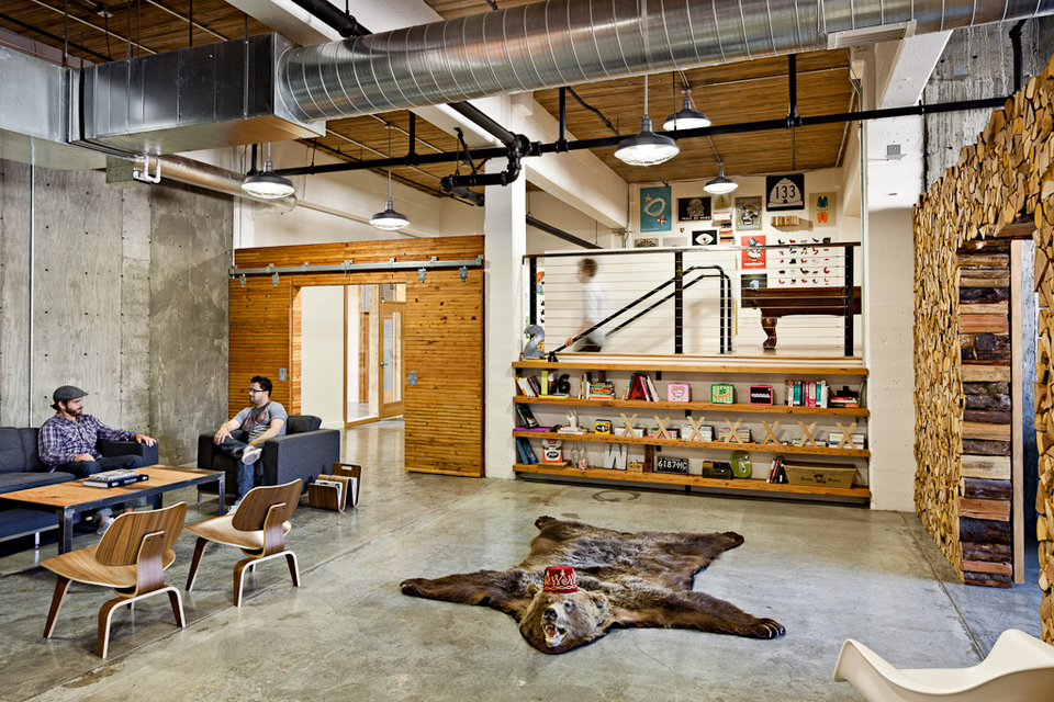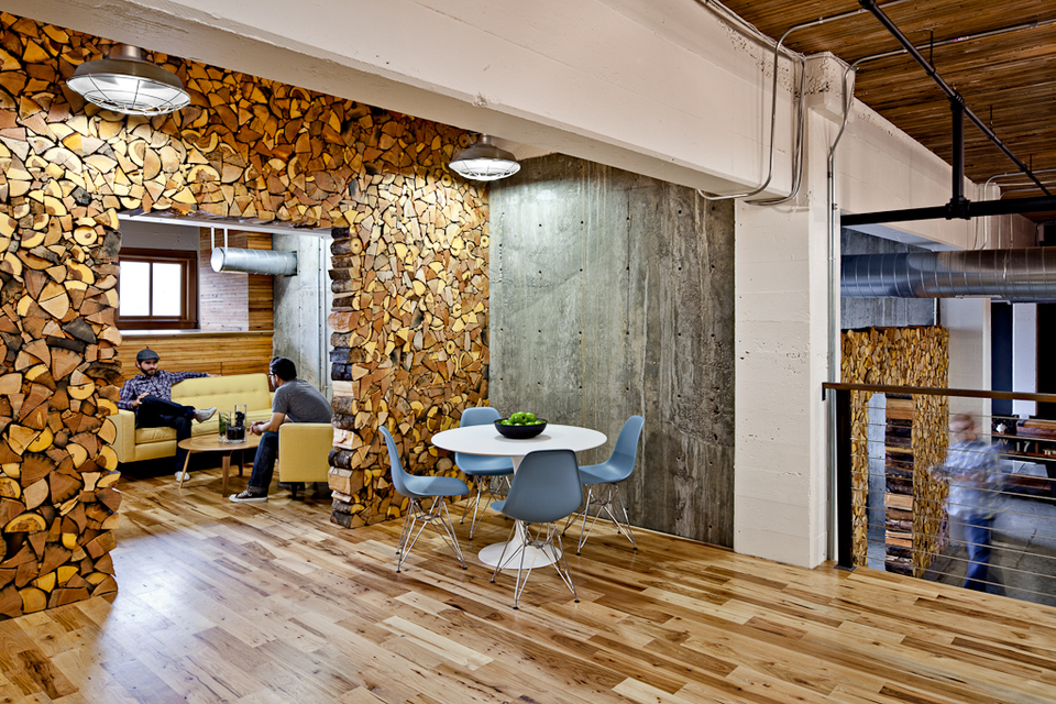 Parliament is a full-service design studio that offers a huge range of services in the fields of print, retail, marketing, and digital design. It bought a raw, factory-style room and put its creativity to work with its team's own hands. Exploring the black colour, concrete, metal, and wood, the Parliament team built one of the most amazing studios around. All the spaces are integrated and explore the simplicity of each element inside the office. The office embraces the rustic charm of a log cabin with, hardwood lining the floors and campfire logs covering the walls. Parliament's office isn't only jam-packed with beautiful things to look at, but it's also full of incredibly talented people.
