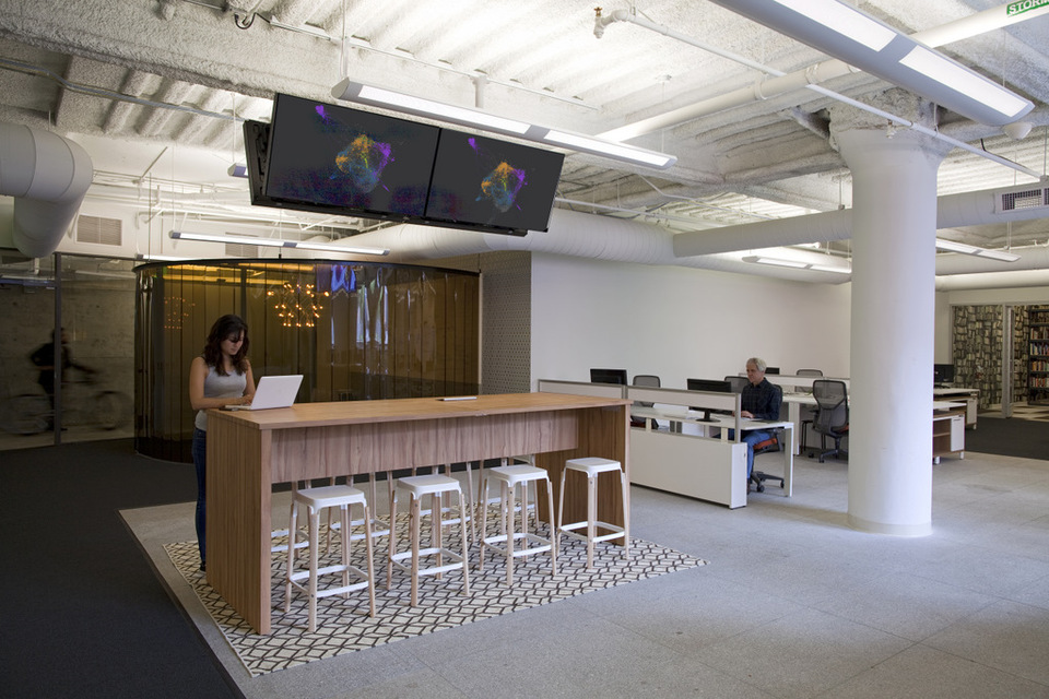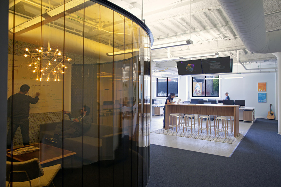 San Francisco is home to many wonderful offices, of which Quid is another example. Quid's office was designed by Studio O+A, a local interior design firm known for designing Facebook, Microsoft, and Yelp's offices, and it's proof that beautiful things don't need to be expensive. Quid's dream office cost just $25,000. To keep the budget low, designers decided to use alternative solutions whenever possible. Rather than build another conference room, which would inevitably make the office feel smaller and the budget tighter, Q+A commissioned a custom metal hoop to hold industrial-grade freezer curtains to form this circular office space. The desks came from a furniture company next door.