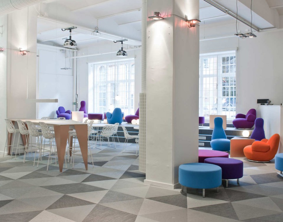 The design of the Skype office isn't only about visual appeal. Skype values a playful work environment in which employees are encouraged to think, play, and stay creative. The layout of the office optimizes the possibility of social meeting points as well as concentrated work. Instead of old-fashioned offices with cubicles, this office offers a mix of regular desks in open office spaces, hot desks, seating areas, meeting rooms, conversation booths, play areas, cafés, and silent areas.
