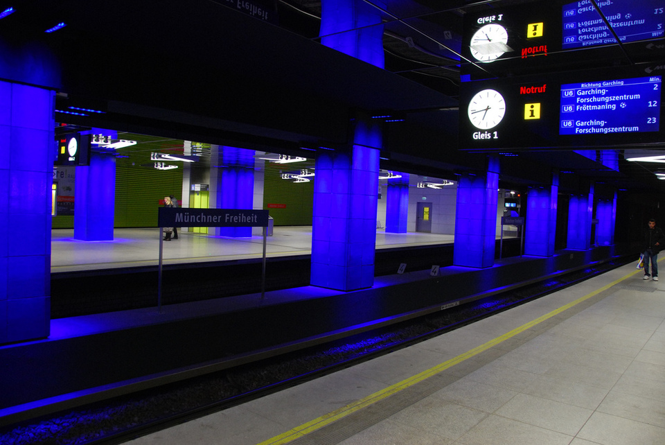 Originally opened to the public in October 1971, this subway station was extensively renovated by lighting designer Ingo Maurer from 2008 to 2009. Despite the fact that most of the station’s major structure was left intact, the station now evokes a very modern, sci-fi feel with lighting panels installed in the walls, columns, and ceiling tiles. Pops of colour emerge intermittently amid the station’s main colour scheme of light grey and porcelain white. Muenchner Freiheit subway station serves as a major junction between the U-Bahn U3 and U6.
