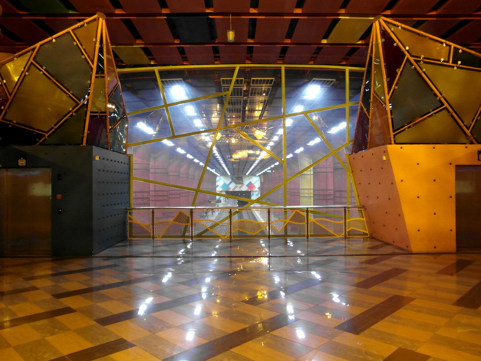 Stepping into Lisbon’s Olaias Station is like stepping into a kaleidoscope of colour! It was recently voted ninth on British newspaper The Telegraph’s list of the 22 most beautiful subway stations in Europe. Designed by architect Tomas Taveira and opened in May 1998, this station is part of Lisbon’s busy red subway line. Steel and aluminum escalators carry transit users down into the station’s depths, bypassing spaces filled with coloured glass panels and intricately decorated structural columns. The station’s multi-coloured floor tiles are haphazardly placed but still look like they line up perfectly. Veins of colour run from the floors and walls all the way up to the ceilings. In the evenings, the station lights dim and bathe pedestrians in a calming, soft yellow glow.