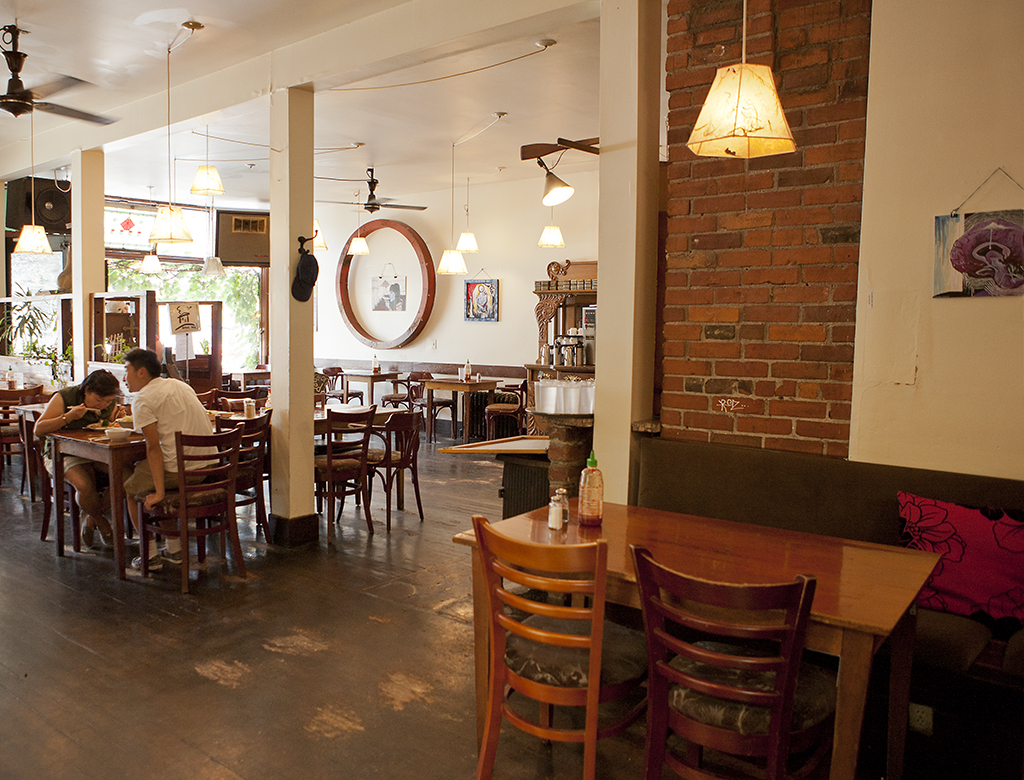 After decades, The Naam retains a relaxed, homey ambiance of wooden tables and floors, far from any corporate restaurant. The walls exhibit paintings and other art work, on a six-week rotation, and each night from 7pm to 10pm there's live music on the table-sized stage, usually solo players from blues, folk and jazz backgrounds, with guitars and sometimes vocals. They're instructed to keep the volume at a level suitable for conversation.