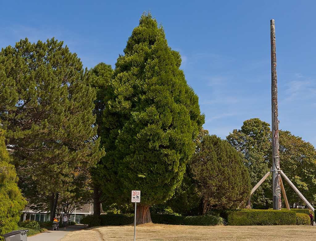 The Centennial Totem Pole it’s a 100 feet (30.5 meters) high and represents one foot for each year of the province’s colonial history to 1958. Each of the ten figures is the crest of one of the ten Kwakiwaka’wakw clans representing the mythical ancestry of the clan. Time and weather have deteriorated areas of the pole so it’s been stabilized at the moment.