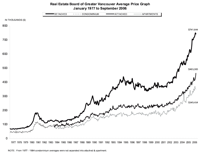 Oct 2006 2 Updated graph of Vancouver housing prices – September 2006 Posted by Jay Banks Here is an updated graph of Vancouver housing prices since 1980 to September 2006. There are separate lines for detached houses, condiminiums, attached properties and apartments in Vancouver. Click the graph to see a larger version.