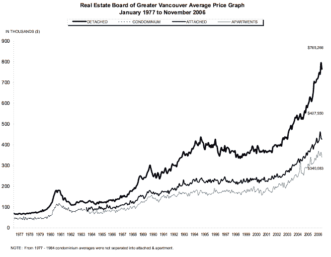 Dec 2006 3 November update on the long-term graph Posted by Jay Banks November update of Vancouver housing prices long–term graph since 1980. There are separate lines for detached houses, condiminiums, attached properties and apartments in Vancouver. Click the graph to see a larger version.