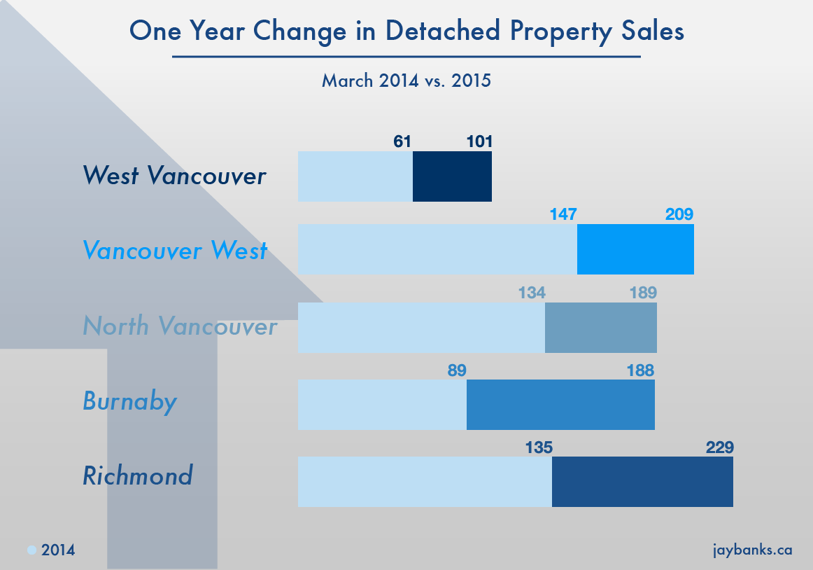 Prices rose in every category but demand was noticeably strong for detached properties. The benchmark detached sale price of $1,052,800 for Metro Vancouver was up 11.2% over March 2014. Vancouver Westside detached properties were up 12.3% to a benchmark price of $2,447,700 in the same period.
