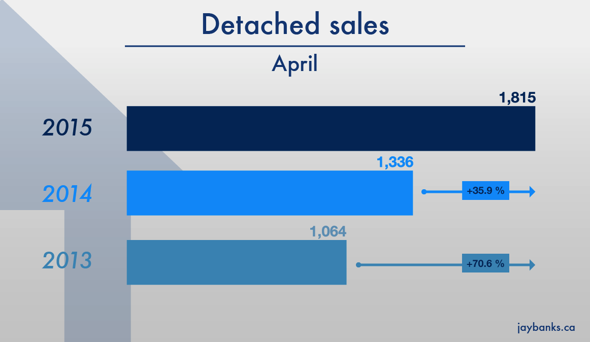 Sellers are in the ascendant. April 2015 sales in the Metro Vancouver market were knocked out of the proverbial park. Particularly for detached properties. Those sales numbered 1,815 which is a 35.9% increase from 1,336 detached sales in April 2014 and a huge 70.6% increase from 1,064 detached sales in April 2013. The benchmark price for a detached property rose 12.5% from April 2014 to $1,078,900.