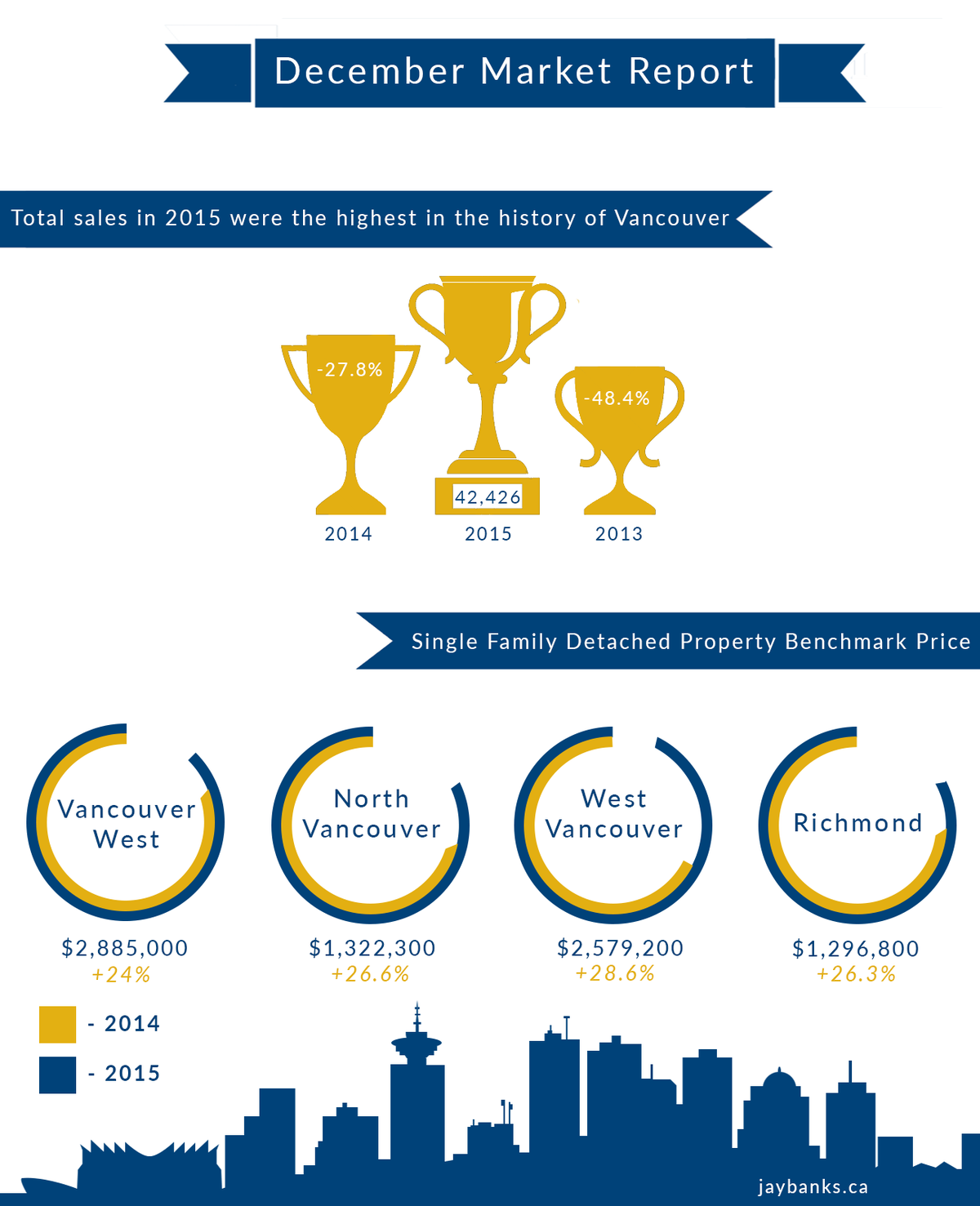 Sales in 2015 were the highest annual total in the history of the Real Estate Board of Greater Vancouver. Sales of detached, attached and apartment properties reached 42,426. This was a 27.8% increase over 33,116 sales in 2014 and a 48.4% increase over the 28,524 residential sales in 2013.