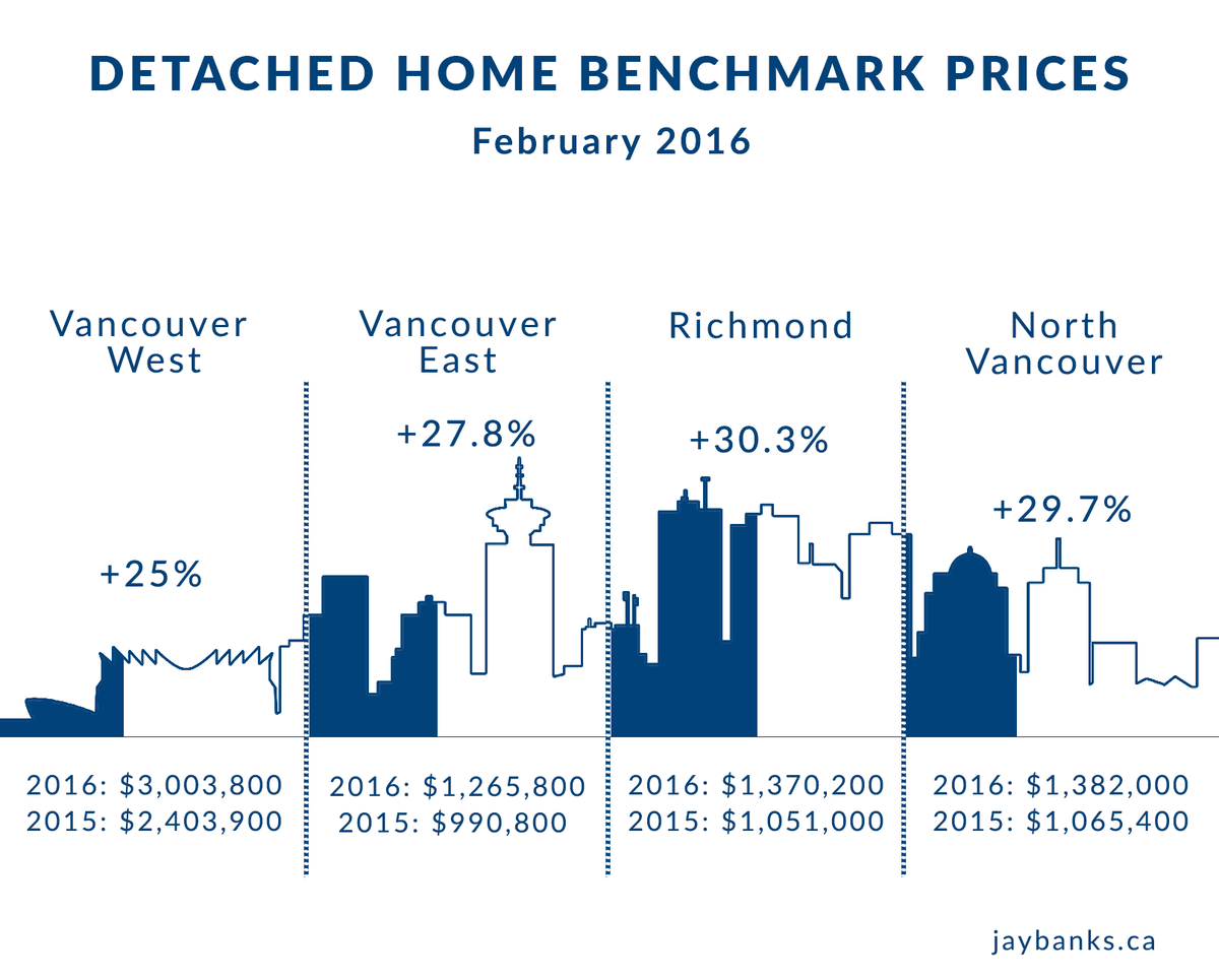 In February the Metro Vancouver real estate market continued to rack up records on numbers of sales and rising prices. The sales were 56.3% above the 10 year sales average for the month. In Vancouver West the benchmark price of a detached home rose to $3 million (most of which are treated as building lots), Vancouver East considered working class for the last 100 years comes in at a benchmark price of $1.27 million and the once far flung suburbs of Richmond at a benchmark of $1.37 million and North Van at a benchmark $1.38 million defy belief.