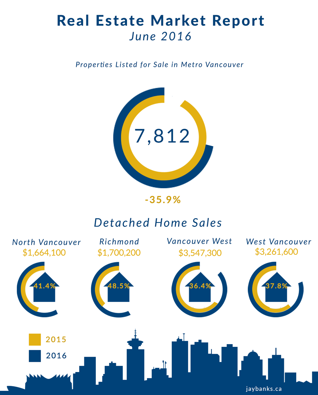 The stats commentary is a little late this month mainly because there is a lot of politicking going on behind the scenes of the published data. "June was busting out all over" according to the musical Carousel and the Real Estate Board of Greater Vancouver. The June 2016 MLS Home Price Index for all residential properties in Metro Vancouver is currently at a benchmark price of $917,800, for detached properties $1.56 million. An incredible 32.1 percent increase from June 2015. The benchmark price for a detached home in the Westside of Vancouver is $3,547,000. This includes the Point Grey and Dunbar areas which are magnets for offshore investors. The benchmark detached home price in North Van is $1,664,100 an increase of 41.4% between June 2015 and 2016. In Richmond the benchmark detached price is $1,700,200 and the one year increase is 48.5%. This was the best-selling June on record.