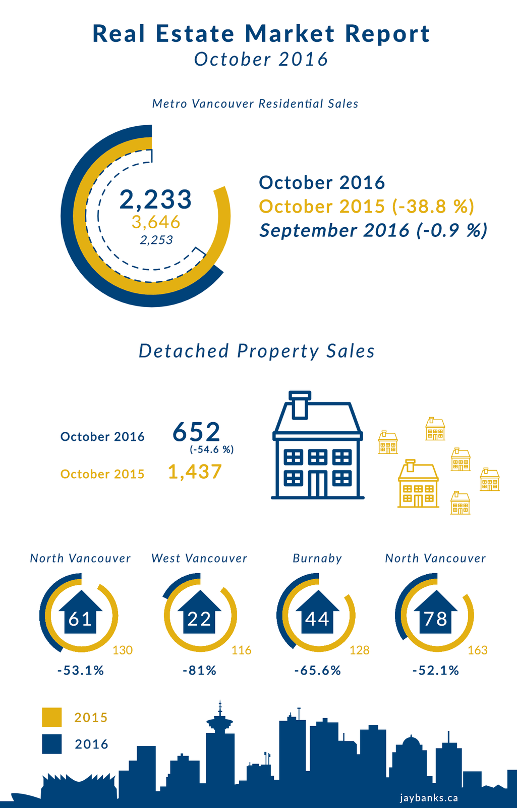 There is a noticeable difference in the number of detached sales: in Vancouver Westside in October 2015 there were 163 sales vs 78 sales in October 2016. In Richmond there were 194 sales vs 61 sales. In North Vancouver there were 130 sales vs 61 sales.